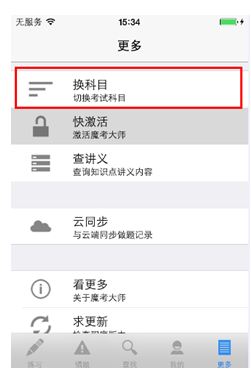 5) 续做功能(首页左侧顶部的”上次”)对于每一个知识点,该软件都设有续做功能,类似书签的功能;假定考生对某个知识点做到了第5题,那么下次进入魔考大师,可点击顶部菜单中的“上次”,进入相应的知识点后的续做即可