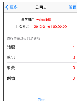 云同步功能,电脑与手机之间,或者手机与手机之间,实现笔记,纠错,错题,和收藏,四大数据的同步。首先注册云同步账号,IOS客户端云同步账号与登陆账号一致。